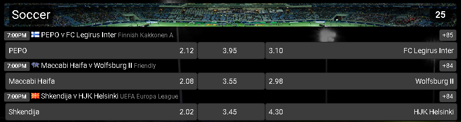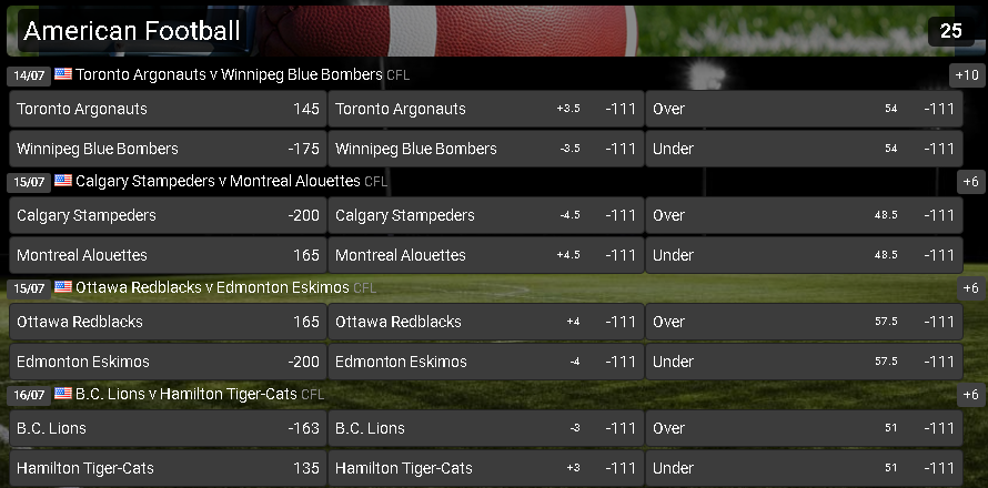 Our system also supports US-style layouts, which is vertical and shows Match Odds/Moneyline on the first column, then spreads on the 2nd and totals (over/under) on the 3rd. And if some event does not include these markets, the software intelligently selects the most popular markets from our other known selections and fills in the blanks.